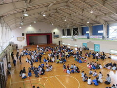今日は縦割り班(Jチーム)の初顔合わせ。グループごとに輪になり自己紹介をしました。温かい拍手も聞こえます。